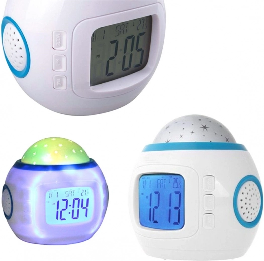 - Vækkeur, der viser en farverig projektion af stjernehimlen i rummet, som ændrer sig i takt med den afspillede melodi.