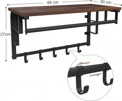 Denne multifunktionelle væghylde tilfører ethvert interiør et elegant industrielt udtryk og en praktisk opdeling af opbevaringspladsen. På toppladen kan du nemt placere dekorationer, blomster eller bøger, mens knager og stang giver plads til frakker, håndtasker og nøgler. Den metalramme sikrer høj stabilitet og lang levetid, selv ved daglig brug.