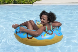 Nyd sommeren med en original badering i form af en lækker donut med blå “glasur” og farvet pynt. Ringen er ideel til afslapning, sikker flyden på vandet og de første skridt i svømmelæring. Takket være den store indvendige åbning støtter den kroppen komfortabelt og gør det let at drive rundt.
