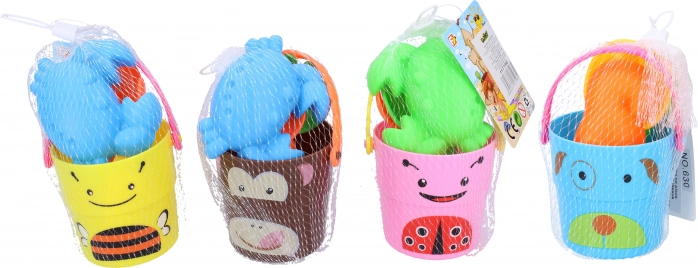 - Sættet indeholder en spand med glade dyremotiver, perfekt til at bære sand eller vand.