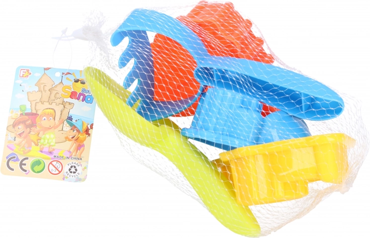 Farverigt sandlegesæt til børn 5 stk.: skovl, rive og 3 forme. Holdbart plast, sikre former, ideelt til sandkasse og ved vand. Fra 3 år.