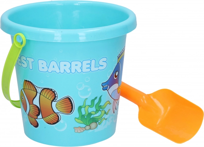 Sandlegesæt til børn: spand 16 cm og skovl. Let, holdbart og ideelt til sandkasse og strand. Fås i blå og orange.
