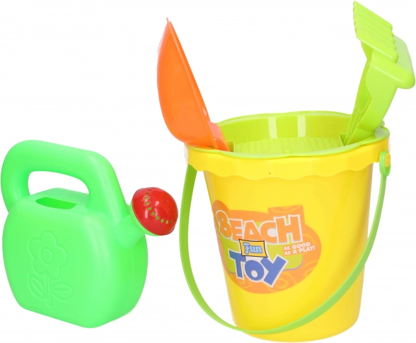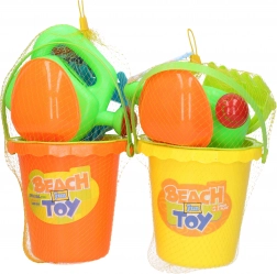 Praktisk sandsæt til børn i størrelsen 15 cm indeholder alt, hvad små byggere har brug for: spand, si, vandkande, rive og skovl. Findes i 2 farvevarianter – gul og orange. Perfekt til legeplads, strand og have.
