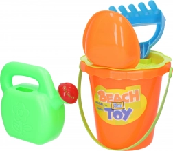 I sættet finder du alt, der behøves til at bygge slotte, lave sandkager og vande: spand, si, vandkande, rive og skovl. Der er to glade farver at vælge imellem – gul og orange, som gør det nemt for børnene at kende deres eget sæt.