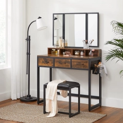 Skab din egen personlige beauty-krog. Dette toiletbord kombinerer rustikt trædekor med en sort metalramme for et moderne, industrielt look. Det tredelte nedklappelige spejl giver den perfekte vinkel under makeup og beskytter overfladerne mod støv, når det lukkes. Spejlets sidevinger har kroge til halskæder, og under toppladen finder du rum til dine mest brugte kosmetikprodukter.