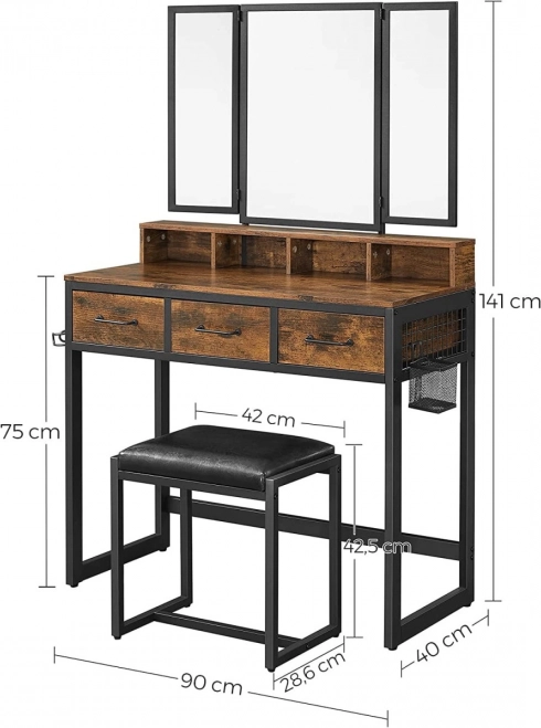 Den brede plade og 3 skuffer rummer makeup, børster og manicureudstyr. Stålkonstruktionen sikrer høj stabilitet, mens skamlen med blød polstring i økolæder tilbyder komfort selv ved længere tids siddende brug. Designet passer nemt ind i soveværelse, garderobe eller entré.