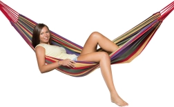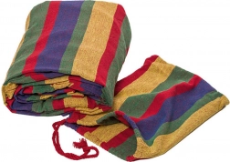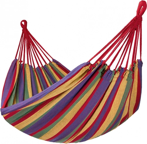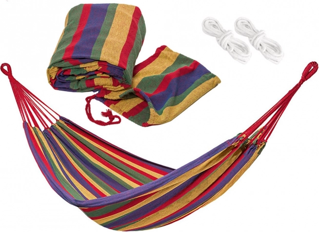 Denne komfortable hængekøje med et muntert stribet mønster er ideel til have, altan og indendørs brug. Bind blot begge ender til faste punkter – træer, kroge eller stolper – og nyd at gynge og slappe af i den friske luft.