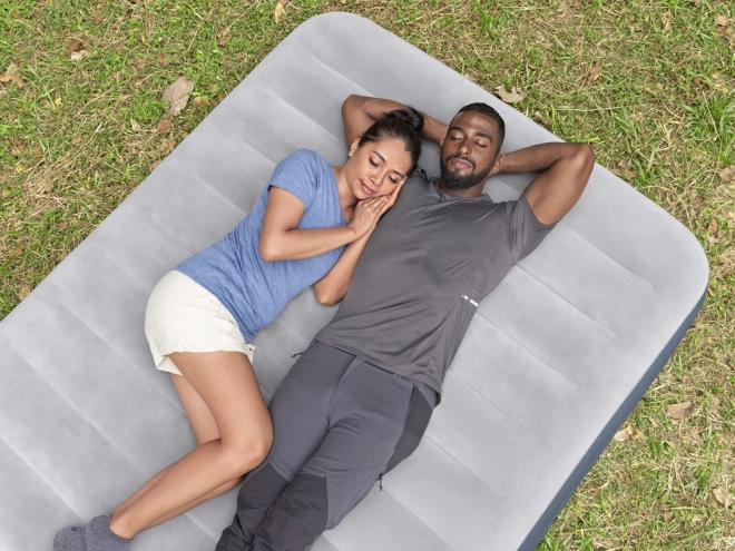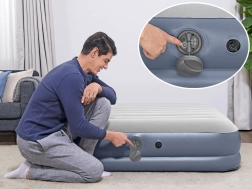 Den indbyggede, aftagelige akkumulatorpumpe oplades via USB, puster madrassen op på cirka 4 minutter og klarer op til to fulde oppustninger på en opladning. Oversiden er belagt med et blødt vinylmateriale for ekstra komfort og en behagelig berøring.