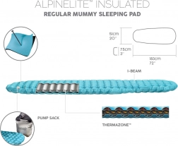 AlpineLite Insulated Regular Mummy liggeunderlaget er det ideelle valg for dem, der vil nyde komforten på stranden, under camping eller overnatning i telt. Oppustning er nem og hurtig takket være det innovative AirCinch system, hvor du blot presser med håndfladerne på posen, og underlaget fyldes hurtigt med luft. Sættet er komplet, så du behøver ikke bekymre dig om at glemme en pumpe.