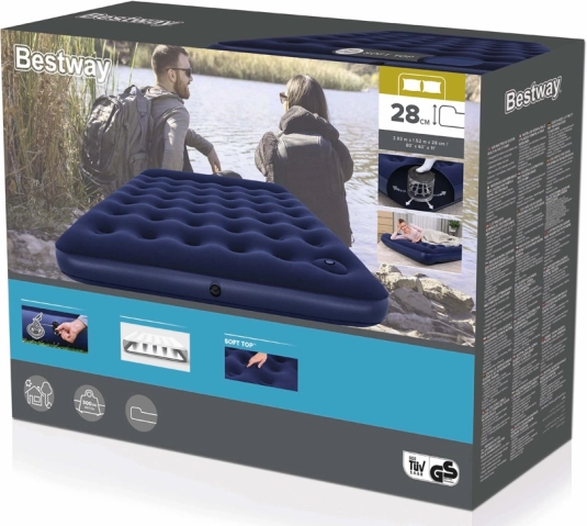 Den oppustelige madras BESTWAY Queen er en pålidelig løsning til gæster, ferie i sommerhus og camping. Den stabile coil‑beam-konstruktion fordeler vægten jævnt og holder sengen behageligt fast, mens den bløde vinyloverflade er rar at røre ved. Den integrerede pude støtter hoved og nakke, så du kan nyde komfortabel afslapning, uanset hvor du er.