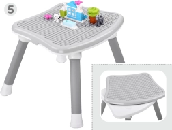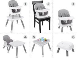 Én stol dækker fodring, spisning og leg: høj og lav stol, sædepåbygning til stol, stol med bord, legeplade til klodser og en praktisk taburet.