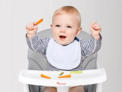 Ergonomisk sæde, åndbart og let aftørreligt betræk, 5-punkts seler og skridsikring mod at glide ned. Skridfaste fødder sikrer stabilitet på enhver overflade.