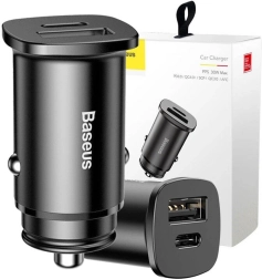 Hold dine enheder altid klar til brug. Baseus Square er en robust 30 W biloplader i metal med dobbelt udgang USB-A + USB-C. Takket være bred support af hurtigopladningsprotokoller sikrer den stabil og sikker energiopfyldning, selv på korte ture.