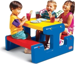 Nyd familiestunder i haven med det robuste børne-picnicbord LITTLE TIKES Jr. i blå. Det har plads til op til 4 børn, er lavet af holdbar plast og har kompakte mål 72 × 84 × 47 cm. Ideelt til udendørs spisning, leg og kreative aktiviteter – stabil konstruktion, nem vedligeholdelse og iøjnefaldende design til enhver gårdhave eller terrasse.