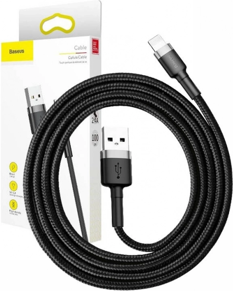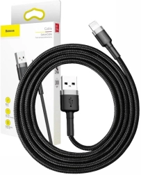 Det holdbare grå–sorte Baseus Cafule-kabel med USB–Lightning-stik tilbyder hurtig opladning på 2,4 A og dataoverførsel på 480 Mb/s. Takket være tekstilermering, aluminiumstik og forstærket bøjebeskyttelse er det ekstra slidstærkt, filtrer ikke sammen og forbinder pålideligt APPLE-enheder med Lightning-port til opladere eller computere.