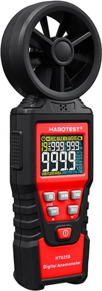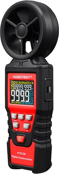 HABOTEST HT625B er et pålideligt anemometer med ottebladet rotor og følsomt lejesensor-system for stabile og hurtige målinger. Den farvestrærke skærm i høj opløsning viser værdier op til 9999 counts, inkl. batteriindikator. Du kan vælge mellem flere hastighedsenheder (m/s, km/t, mph, ft/s, knob) og luftvolumen (CFM/CMM/CMS), så instrumentet nemt tilpasses din arbejdsgang.