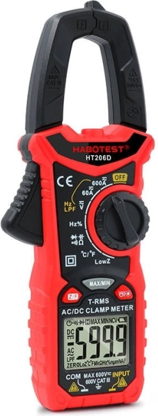 Professionel digital tangmultimeter HABOTEST HT206D leverer præcise målinger med True RMS, berøringsfri spændingsdetektion NCV, LPF-filter til switch-mode strømforsyninger og et overskueligt baggrundsbelyst LCD-display. Med kæber på Ø 26 mm, måling af AC/DC-spænding og -strøm, modstand, kapacitans, frekvens og temperatur er den ideel til elektrikere og krævende hobbybrug.