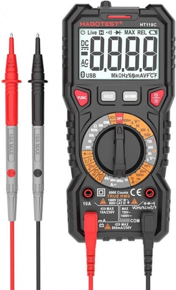 Alsidigt digitalt multimeter HABOTEST HT118C med True RMS teknologi leverer præcise målinger af AC/DC spænding og strøm, modstand, kapacitans, frekvens og temperatur. Det har NCV til berøringsfri spændingsdetektion, batteritest 1,5/9 V, MAX/MIN, HOLD og diodetest. Den store LCD-skærm med dobbelt baggrundsbelysning, LED-indikering af indgangsporte og indbygget lygte gør arbejdet lettere i mørke, mens det sammenklappelige stativ muliggør komfortable handsfree-målinger.