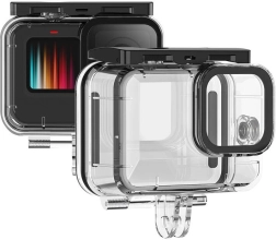 Det vandtætte etui fra Telesin gør det muligt at optage unikke videoer selv på betydelige dybder. Det beskytter effektivt dit udstyr mod vand. Ekstra tætning giver pålidelig beskyttelse. Etuiet er desuden gennemsigtigt, og kamerats linsecover er lavet af hærdet glas, hvilket sikrer tilstrækkelig lystransmission.