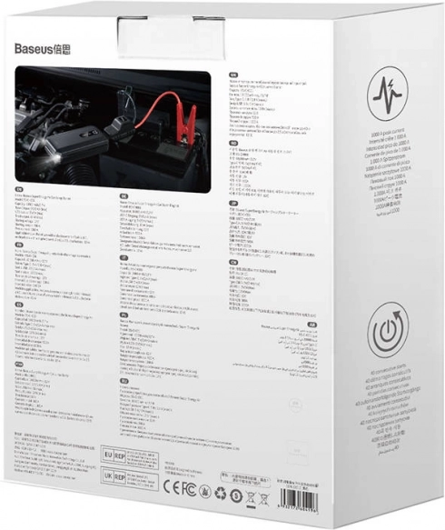 BASEUS Super Energy er en multifunktionel bilstarthjælp og powerbank i ét. Med en kapacitet på 10000 mAh og spidsstrøm på 1000 A starter den sikkert køretøjer med 12 V-systemer (benzin op til 4 l, diesel op til 2,5 l). Takket være USB‑A- og USB‑C-portene (op til 2,4 A) oplader du hurtigt telefon, hovedtelefoner og anden elektronik – ideel til rejser og nødsituationer.