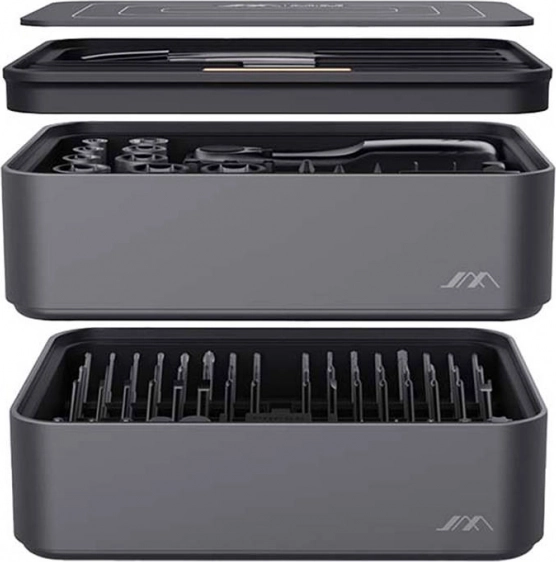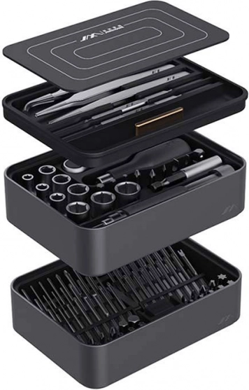 Til præcist og skånsomt arbejde med elektronik indeholder sættet 3 typer pincetter og 2 kileformede åbningsværktøjer til sikker åbning af enheder uden risiko for ridser. På det næste niveau findes skraldenøgle, skruetrækkerhåndtag, adaptere og praktiske forlængerdele. Der medfølger også toppe 5–13 mm og 8 grundlæggende 6,35 mm bits (H5, H4, H3, 5PH2, 5PH1, 3PH1, SL5, SL3).