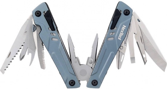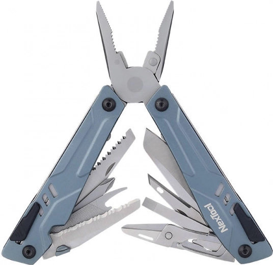 Nextool multiværktøjet indeholder 15 forskellige værktøjer, herunder spidstang, træsav og flaskeåbner.