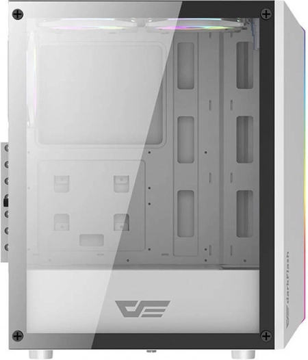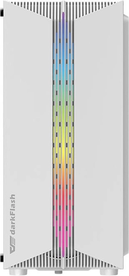 Kabinetttet er gennemtænkt til effektiv luftstrøm – det leveres med 3 blæsere (DarkFlash C6 White) og understøtter op til 6 blæserpladser samt installation af vandkøling (op til 360 mm foran). Det indvendige rum rummer uden problemer GPU op til 290 mm og CPU-køler op til 160 mm. Selvfølgelig med et praktisk I/O-panel med USB 3.0, USB 2.0, lydstik og knapper til strøm, reset og LED.