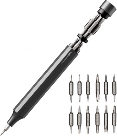 HOTO-skruetrækkeren er udstyret med et magnetisk hoved for nem indsætning og fjernelse af bits. Det ergonomiske design sikrer komfortabel arbejde uden at glide. Med en vægt på kun 110 g og dimensioner, der kan sammenlignes med en kuglepen, er den nem at bære hvor som helst.