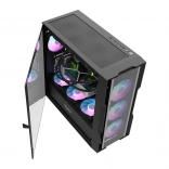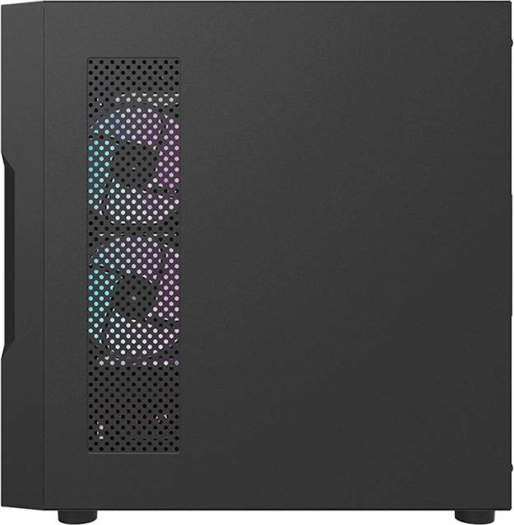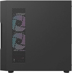 Den forreste mesh-panel med PVC-filter sikrer glimrende lufttilførsel, mens det gennemsigtige sidepanel i hærdet glas på hængsler giver nem adgang til komponenterne og en flot præsentation af ARGB-belysning.