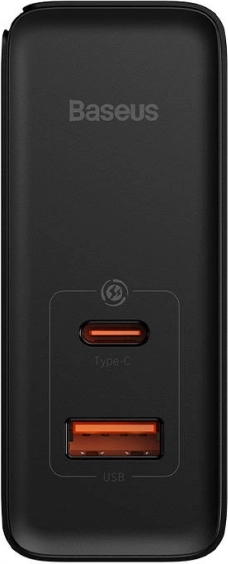 Med to porte, USB-A og USB-C, muliggør Baseus GaN opladeren samtidig opladning af to enheder med op til 65W og 30W.
