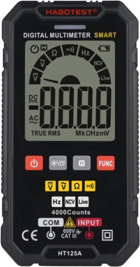 Det kompakte digitale multimeter HABOTEST HT125A er en pålidelig hjælper til elektrikere og hobbybrug. Det tilbyder præcis måling af AC/DC-spænding, modstand, frekvens samt test af kontinuitet og dioder. Takket være true RMS, NCV berøringsfri spændingsdetektion, Live Test, bagbelyst display og integreret lygte giver det sikker og komfortabel måling overalt.