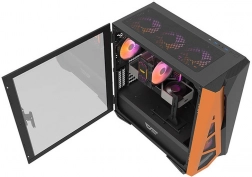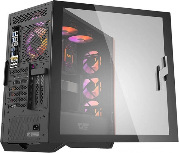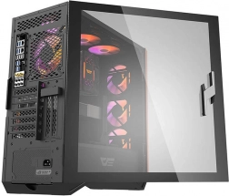 Den åbne glaslåge fremhæver elegant dine komponenter og RGB. Et praktisk håndtag gør hurtig adgang til hardware og vedligeholdelse nemmere.