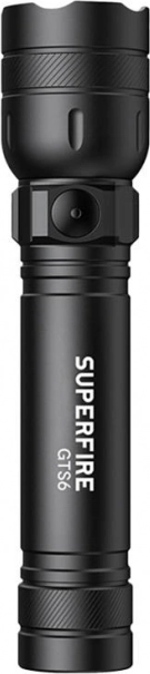 Den kompakte lommelygte SUPERFIRE GTS6 tilbyder lys på 360 lm, rækkevidde op til 150 m og 5 lysindstillinger. Den har USB‑C opladning, driftstid op til 2 timer, et robust aluminiumshus og IP44‑klassificering for pålidelig brug derhjemme, på vandreture og ved camping.