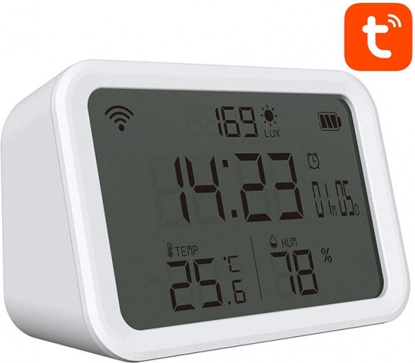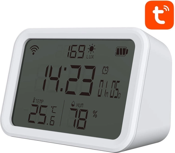 Få overblik over indeklimaet med et enkelt blik. Den smarte NEO‑sensor måler præcist temperatur, luftfugtighed og lysintensitet, viser data på et stort, letlæseligt display og leverer realtidsdata via Wi‑Fi 2,4 GHz og TUYA‑appen. Derudover får du ur, dato og en praktisk alarm.