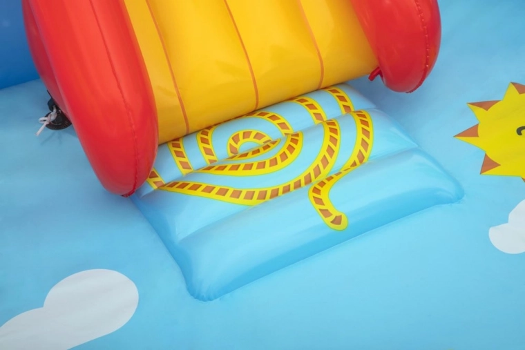 Legecentret kombinerer vandsjov med bevægelse og lege: børn kan suse ned ad den aftagelige rutsjebane, prøve ringspil på hestesko og ride på den oppustelige hest. Når legen er slut, tømmer du blot vandet, og poolen er let at pakke sammen. Pakket inklusive en reparationslap for længere levetid.