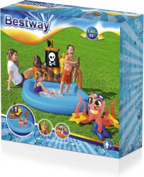 Det oppustelige børnelegeområde med pirattema bringer kreativ vandglæde til enhver græsplæne. Takket være de kompakte mål 140 × 130 × 104 cm passer det også i mindre haver, mens de bløde men robuste vægge af PVC giver komfort og sikkerhed under legen.