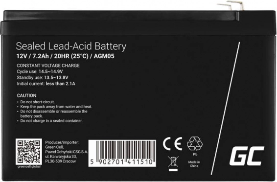 Pålideligt genopladeligt AGM-batteri 12 V / 7,2 Ah fra GREEN CELL til UPS, alarmer, sikringssystemer og nødstrøm. Tilbyder vedligeholdelsesfri drift, høj sikkerhed takket være VRLA/AGM-teknologi og lang levetid på op til 5+ år. Ideelt til både cyklisk og standby-brug.