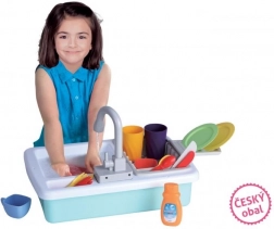 Pakken indeholder et farverigt sæt til en komplet opvaskeplads. Fyld blot beholderen med vand, indsæt batterier, og legen kan begynde.