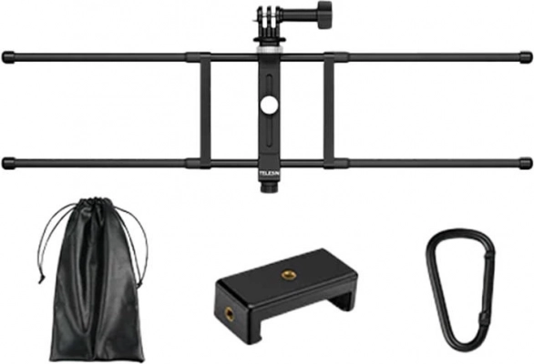 Den universelle hegnholder Telesin TE-FM-001, designet til nem brug, tilbyder fleksibel montering på forskellige typer net og overflader. Den gør det let at tilpasse optagelserne takket være en glide-skinne, hvilket sikrer præcis positionering af kamera eller telefon.