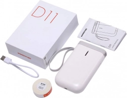 Enheden tilsluttes via Bluetooth til telefoner med Android og iOS. Det kompakte kabinet (132 × 79 × 29 mm, 182 g) med praktisk snor er ideelt til rejser og kontor. Det integrerede 1500 mAh batteri sikrer bekvem drift, og opladning sker via micro USB. I pakken medfølger en startrulle (op til 160 etiketter), så du kan begynde at printe med det samme.