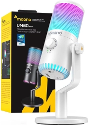 MAONO DM30 RGB er en kompakt bordmikrofon, der kombinerer professionel optagekvalitet med et attraktivt design. Den tilbyder 7 farver og 5 RGB‑gradienter, så den passer perfekt ind i dit gaming‑setup, og med kardioid optagelse undertrykker den effektivt baggrundsstøj og fremhæver din stemme.