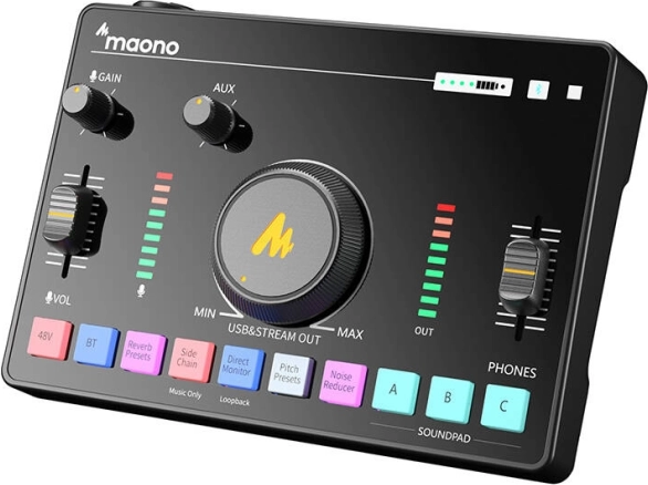 Til content creators findes 3 programmerbare pads til egne samples, SideChain til automatisk at sænke musikken under tale og Music Only til at fjerne vokaler fra baggrunden. Uafhængig volumenstyring for mikrofon og baggrund, tydelig batteriindikator og bred kompatibilitet med platforme som YouTube, Twitch og OBS er også på plads.