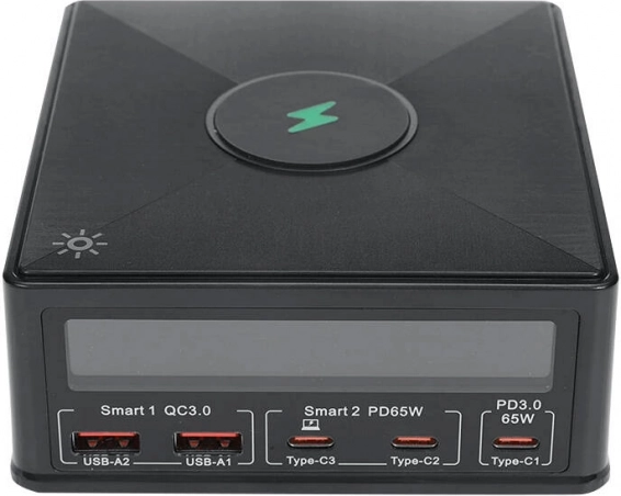 Den integrerede trådløse opladeplade 15 W giver kabel‑fri bekvemmelighed. LCD‑display giver overblik over opladningsforløb, skridsikre elementer og temperaturkontrol øger sikkerheden. Den kvalitetsrige konstruktion i PC+ABS er holdbar til både hjem og kontor, og den brede indgang AC 100–240 V er praktisk på rejser.