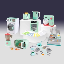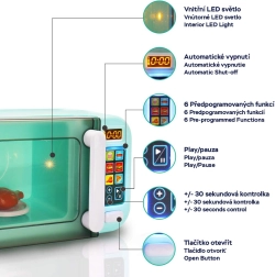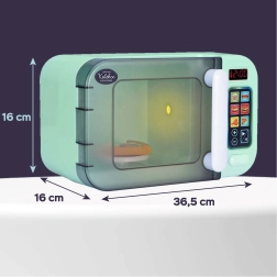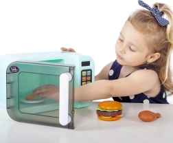Pynt dit lille køkkens chefs køkken med en luksuriøs børnemikroovn med touchpanel. Denne interaktive mikroovn laver lyde som en rigtig og lyser. Programmeringen omfatter drejning af tallerkenen med en efterligning af mad inde i mikroovnen.