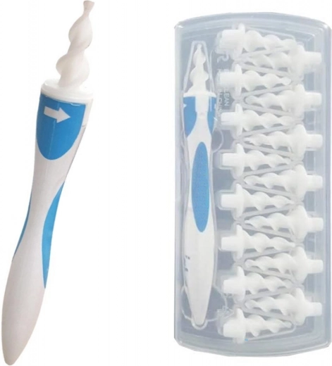 Praktisk og sikker ørerenser med 16 udskiftelige silikonespidser. Den bløde, fleksible spids muliggør skånsom og effektiv rengøring samt tørring af ørerne uden smerte. Ideel til rejser for hele familien.