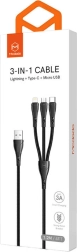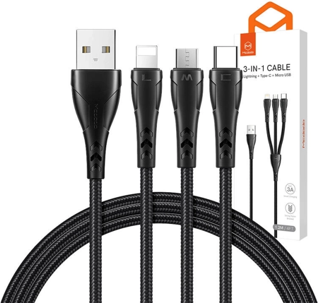 Ét kabel, tre stik – med USB‑C, Lightning og Micro USB dækker du de fleste moderne enheder: smartphones, tablets, trådløse høretelefoner og powerbanks. Kablet kan forsyne op til tre enheder på én gang, så du sparer både plads og tid.