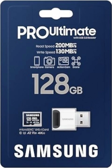 Samsung PRO Ultimate microSDXC med 128 GB kapacitet leverer topydelse til hurtige overførsler og jævn 4K‑optagelse. Med hastigheder op til 200 MB/s ved læsning og 130 MB/s ved skrivning håndterer den pålideligt store filer, sekventiel optagelse og app‑arbejde.