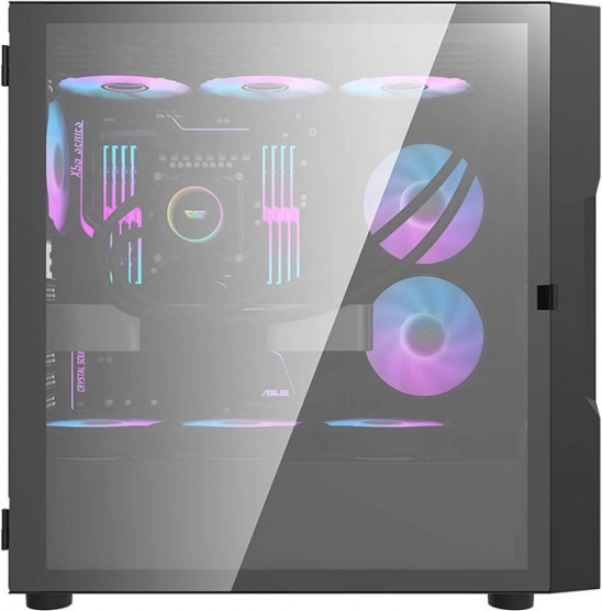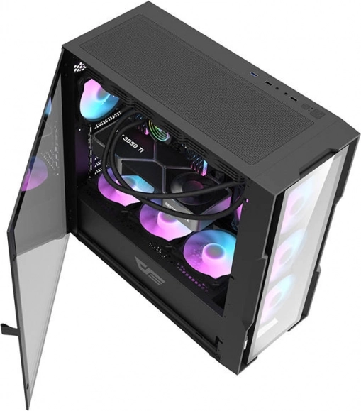 Darkflash DK431 Glass Computerkabinet giver dig mulighed for at skabe en attraktiv og funktionel computersamling. Åbne paneler, inklusiv sidepaneler af hærdet glas, viser de indre komponenter, mens de integrerede RGB-ventilatorer sikrer optimal køling.