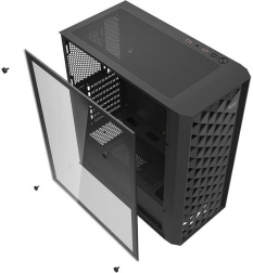 Computerkabinet Darkflash DK351 er designet til dem, der vil bygge en kraftfuld gaming- eller arbejds-pc med perfekt komponentlayout. Kabinettet er udstyret med et stilfuldt sidepanel i hærdet glas, som effektivt fremhæver de interne komponenter. Frontpanelet tiltrækker opmærksomhed med sit industrielle design og geometriske mønster.