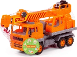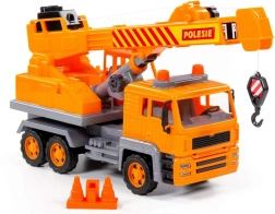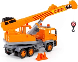 Serien af specialmaskiner "Diamant" med svinghjul fra producenten Polesie omfatter de vigtigste typer køretøjer, der i virkeligheden bruges ved forskellige arbejdsopgaver. Bilerne har et realistisk udseende med fokus på detaljer: der er imitationer af forlygter, blinklys og tre par hjul på metalaksler. Kranbilen er udstyret med en drejelig platform og en udtrækkelig bom med en ophængt krog. Krogen kan hæves og sænkes ved hjælp af en manuel mekanisme. Legetøjet indeholder også vejkoniske kegler, som gør legen mere spændende og komplet.
